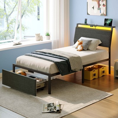 This platform bed with storage offers a sleek, modern design with practical features. It includes four spacious under-bed storage drawers on wheels and an adjustable headboard shelf, perfect for organizing clothes, books, and daily essentials in smaller spaces. The bed comes with RGB LED lights offering over 60,000 colors, brightness levels, and music sync, controlled via remote or mobile app, adding ambiance for any occasion. Equipped with a built-in charging station on the headboard, it features two AC outlets, two USB ports, and a Type-C port, making it perfect for charging devices in kids’ or teens’ rooms. Constructed with a sturdy metal frame, it supports up to 660lbs, while each storage drawer holds up to 55 lbs. The wood panels on the headboard and footboard help keep things clean. Easy to assemble with clear instructions, this industrial-style bed frame fits seamlessly into any modern bedroom.
