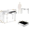 Our silver computer desk, made of faux panel and glass with mirror, comes with two drawers and has a beautiful shape. This mirrored computer desk is suitable for any room and will add splendor to your home. It features a mirrored finish that adapts to any environment without overpowering it, yet catches your eye with its unique presence. The shimmering mirror reflects the entire composition. The practical size and functionality works equally well in both the study and the bedroom.
