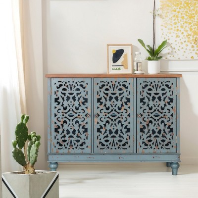 Vintage Blue Display Storage Sideboard with 2 Hollow-Carved Doors, Elegant Accent Cabinet for Living Room, Entryway, or Small Spaces-Panipeachy