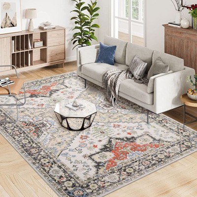Boho Vintage Floral Distressed Area Rug Low Pile Machine Washable Stain Resistant Pet Friendly Floor Mat Non Slip Carpet for Living Room Bedroom