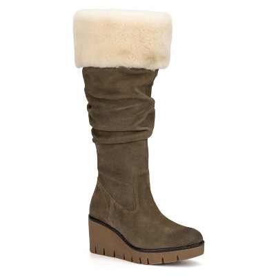 Get ready for whatever the day brings with the Kelly boot, where rugged style meets cozy comfort. Crafted with a soft suede upper that hits mid calf, this boot features a full lace up front for a secure, customizable fit. A cozy lining adds warmth, while the fold over option gives you versatile styling. Branded detailing at the vamp adds a signature touch, and the round toe with a short stacked heel keeps every step grounded in comfort and cool weather style.