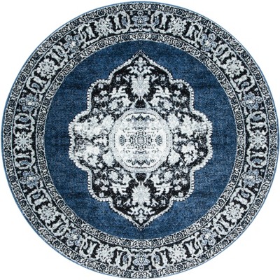Introducing our exquisite 3' X 3' Round area rug, a masterpiece of the transitional style that brings a blend of tradition and modernity into your space. Boasting a stunning blue and grey color palette, this rug exudes sophistication and creates a serene atmosphere in any room. The round shape with a comfortable height of 5/8" ensures it fits perfectly in diverse settings, from cozy nooks to prominent spaces.