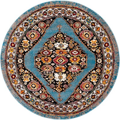 The transitional style seamlessly bridges classic design with modern aesthetics, making it an ideal choice for any decor. Featuring an intricate pattern, the rug presents a central geometric medallion encompassed by floral motifs and an ornate border, reminiscent of heritage craftsmanship. This round area rug is not only a visually stunning centerpiece but also a testament to craftmanship and quality, perfect for creating a refined ambiance in your home.