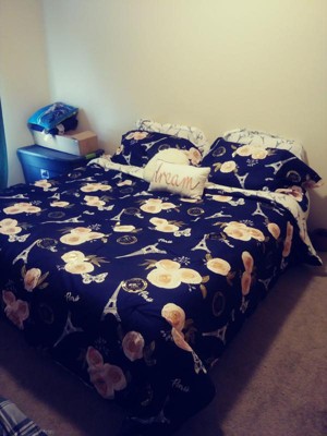 [This review was collected as part of a promotion.] I got this bedding set for my daughter and she loved it. The colos are perfect for her room, she really loves the print with the Paris theme with the roses, butterflies. The comforter is made extremely well and fit perfectly on my daughter's bed. The material is really nice and looks the same after washing. I like the reversible option, I have done the black and will do the lighter side next week. The pillows are my daughters favorite, she uses they all the time. Now I need one for myself.