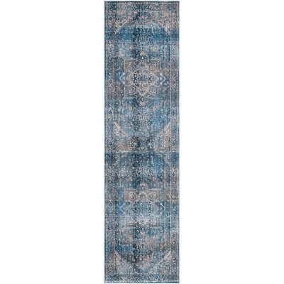 Elevate your hallway or narrow space with this elegant Ivory/Blue Runner Area Rug. Sized at 2 feet 2 inches by 8 feet, this beautiful transitional-style runner rug features a low-profile height of 1/4 inch, making it a perfect choice for high-traffic areas and easy door clearance. The power-loomed construction from premium polyester ensures durability and a soft touch, while the intricate pattern showcases a stunning blend of ivory and blue with distressed effects for a vintage-inspired look. Skillfully made in Turkey, the rug's design offers a harmonious balance of traditional charm and contemporary appeal, suitable for a wide range of home decor. Add a touch of sophistication to your floors with this exquisite runner rug that promises to enrich your interior with its timeless pattern and serene color palette.