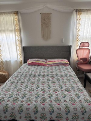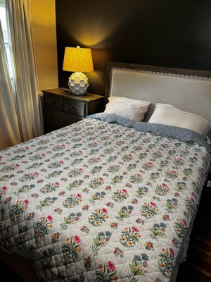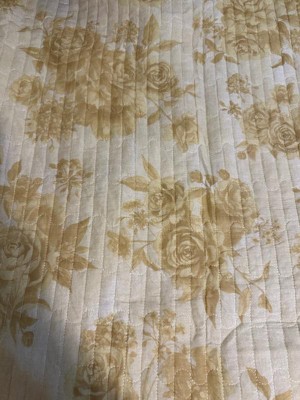 [This review was collected as part of a promotion.] Starting with appearance, the quilt is a beautiful mustard with a feminine floral print. It has horizontal stitching that gives it some texture. As for function, it is very thin. In any sort of cool climate, this will not work as a comforter, but will work nicely as an additional blanket in the spring/summer on cool nights. I have it in our guest room, which is the perfect spot for occasional use. Overall, I would recommend as a decorative touch, but not as a heavy use quilt.
