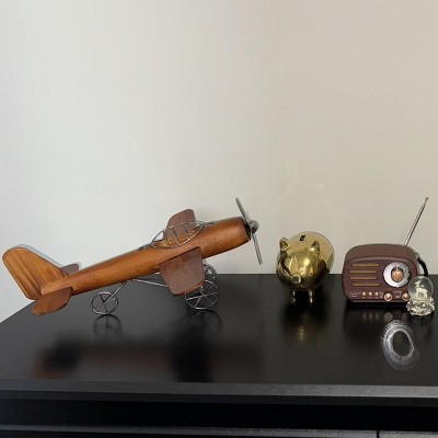 Be reminded of the early days of flight with this vintage style brown wood airplane sculpture in your classics inspired home. This fir wood constructed sculpture features an old propeller aircraft design in brown finish. The fuselage is crafted from the strong fir wood while the pilot roll cage, propeller, and wheel sets are made from iron. The overall aesthetic of this sculpture is distressed in nature, perfect for adding that vintage vibe in your home when displayed on shelves, desks, or tables. Get nostalgic with this vintage airplane miniature displayed on your console, coffee, or office table. Wipe clean with a dry cloth. Suitable for indoor use only. Vintage inspired. This item comes shipped in one carton.