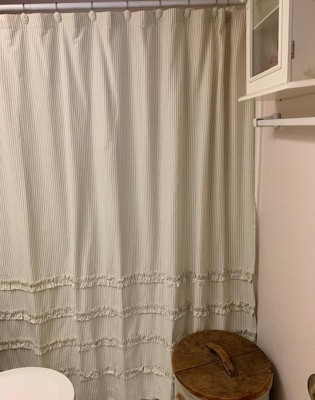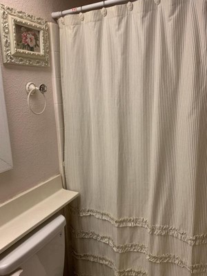Decorate your bathroom with the Lush Decor Vintage Stripe Yarn Dyed Cotton Shower Curtain. Subtle texture and a classic pattern makes this shower curtain the perfect addition to any home. This striped shower curtain features classic pinstripes and rows of ruched ruffles, adding a unique look to an otherwise minimalist shower curtain. Every cottage and farmhouse style home needs a little vintage charm. This shower curtain for bathroom is crafted from an 80% recycled cotton/20% recycled polyester fabric blend. This bathroom curtain measures 72 inches on each side and should fit most standard bathtubs. Installation is easy with 12 button holes at the top to hang with shower hooks or rings. Pair this fabric shower curtain with a liner, sold separately. To care for this bathroom curtain we recommend to dry clean only.