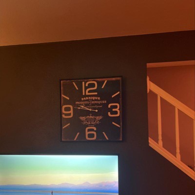 This vintage wall clock will match your classic style interior perfectly when displayed on walls. Requires 1 AA battery. Battery not included. This item ships in 1 carton. This wall clock features number markers, clock hands, and wordings. The clock mechanism runs silent. Square-shaped analog wall clock with a thin black frame. Can be hung vertically using the keyholes on the back; nails and screws not included. Suitable for indoor use only. This item ships fully assembled in one piece. This is a single black colored kitchen clock. Vintage style. “Fabrique de Produits Chimiques et Pharmaceutiques” typography.