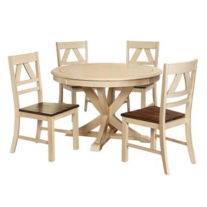 Country styling does not have to be the same old thing thanks to the 5pc Vintner Dining Set. Constructed entirely of rubberwood and finished in antique white with contoured oak seats. The round table shape helps to update smaller rooms while still providing roomy seating space for four. The bead board tabletop and a gently curving crossed table base bring your room out of the ordinary. Overall Table Width: 47.5 inches Overall Table Height: 30 inches Overall Table Depth: 47.5 inches Overall Chair Width: 19 inches Overall Chair Height: 38 inches Overall Chair Depth: 22 inches Seat Width: 18.8 inches Seat Height: 17.8 inches Seat Depth: 17.3 inches