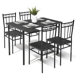 The dining table and chairs are supported by metal legs and possess a robust structure. Thick planks and strong metal with a smooth finish ensure sufficient weight to offer you a reliable dining experience. The table has a load-bearing capacity of up to 220 pounds, and each chair can withstand a weight of up to 330 pounds. The 43.3-inch table top complements various decorative styles. Additionally, the smooth surface and rounded corners of the desktop are effortless to maintain, ensuring that this elegant dining table chair remains functional and beautiful for many years to come. The rustic surface makes it an ideal complement to the living room, kitchen, and dining room. Furthermore, all the mess can be cleaned up with a single wipe, which is convenient. Compared with dining chairs with armrests, armless dining chairs provide people with an open feeling. When not in use, the chairs can be neatly stored under the table, liberating valuable space for other activities. The size of these chairs has been meticulously designed so that they can be easily hidden under the table after use, saving precious space. The chair's reclining backrest has been ergonomically designed to offer optimal support for your back, providing comfort during prolonged sitting. Besides, every corner of our kitchen table set is rounded, minimizing the risk of injuries in the event of accidental collisions. Moreover, the dining chairs are equipped with non-slip foot pads that enhance stability. The dining table for four people consists of a rectangular dining table with dimensions of 43.3 "x 26.8" x 29.3 "(L x W x H) and four chairs with dimensions of 16.1¡±x 14.6¡±x 34.3¡± (L x W x H), which is suitable for small to medium-sized gatherings and family meals at home. Moreover, it can serve as a work table or a game table as per your requirements.