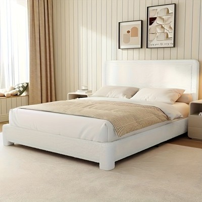 Fluffy Boucle Fabric:The platform bed frame is upholstered in a cloud-like terry fabric and premium foam fillings, which are soft to the touch and provide better back support. Modern boucle bed frame fills your home with warmth and calm. Curved Anti-collision Design:Featuring a simple stylish curve-shaped and line design on the headboard and footboard, the upholstered bed frame reduces injuries caused by everyday bumps and is suitable for kids and adults. Sturdy Construction:This cloud bed frame is constructed with sturdy legs, a support metal frame, and solid wood slats, greatly enhancing the sturdy stability of the bed, equipped with quiet foam that is designed for noise-free sleep. Adjustable Headboard.The headboard of the cream bed frame has 3 height levels which can accommodate 8-12 inches thick mattresses. Soft boucle fabric adds a touch of warmth to your bedroom, lying on the bed like sleeping on a soft bed frame.
