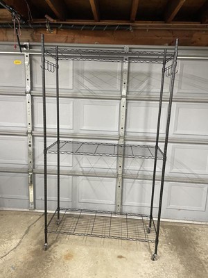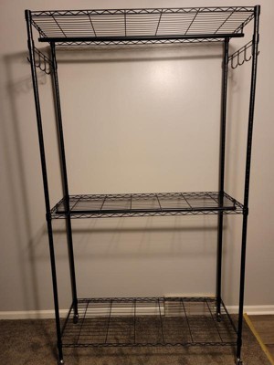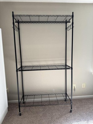 Overall, I'm satisfied with this product. The rack is very sturdy and has lots of room for hanging clothes and storing bins or shoes. However, it does feel a bit wobbly at times, especially when moving it around. The wheels are convenient. Once it’s in place, it holds up well. I am going to use it in my garage for now as a place for boots, wet coats, etc. to go. One thing to keep in mind is that it's very tall! Make sure you have a space with high enough ceilings, as it could be tricky to fit in smaller rooms or closets. Overall, if you need a good amount of hanging space and have the room for it, this rack will do the job nicely.