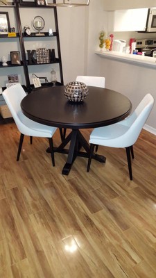 Love the black legs and black vinyl, very well made, looks great with my white table, very comfortable