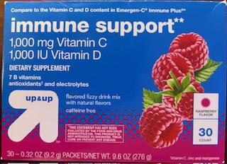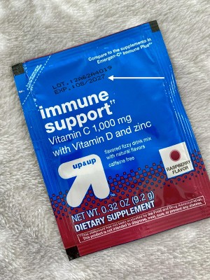 Boost your immune system with help from 30-Count Vitamin C + D Immune Support Powder from up&up™. The caffeine-free fizzy drink mix can be easily added to water, orange juice or your chosen beverage to provide you with 1,000 milligrams of vitamin C and 1,000 international units of vitamin D, along with seven B vitamins, antioxidants and electrolytes. Plus, you'll love that it has a natural raspberry flavor to make it easier to take.