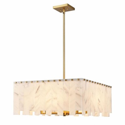 An inspired Art Deco motif plays out to deliver ambient lighting with a commitment to eloquent design aesthetics. Choose this decadent four-light pendant from the Viviana collection to deliver impacting ambiance with alabaster-like strips alternating in length and arranged around a squared polished nickel finish steel frame. Whimsical rivot detailing adds an industrial feel to this pendant that goes with the flow as it complements a gritty rendition of toned-down glam in a kitchen or entryway.