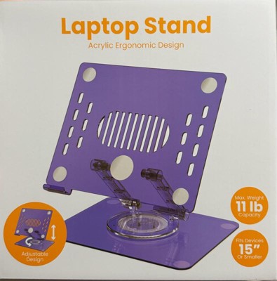 [This review was collected as part of a promotion.] It say loptop stand but i found it hard way to use with my laptop. It works better with ipad. Acrylic material so it easy to break. Can adjust and do 360 rotation.