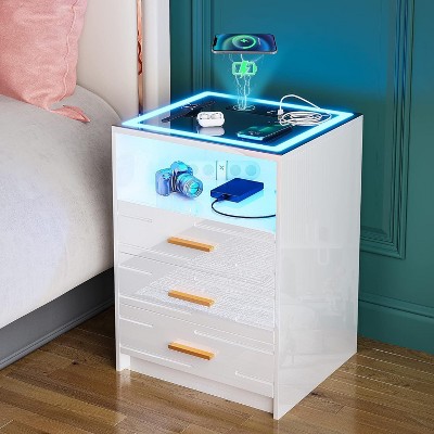 This smart nightstand features a hidden storage compartment and built-in charging station with USB ports. It includes 3-color LED lighting with a motion sensor for added nighttime convenience. Designed for both bedroom and study room use, its compact design offers practical storage with a sleek, modern finish.