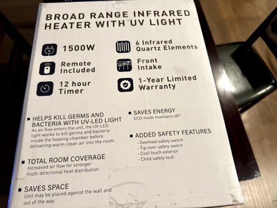 [This review was collected as part of a promotion.] Got this product for exchange of my honest opinion, it came in at a perfect time and making it worth trying.. unit is big enough to cover larger -mid size rooms like family room or master bedroom.. we decided to use this for out basement, which makes perfect space heater.. comes with remote for comfort and convenience.. Love the unique features like built in UV Led light that helps kill bacteria and germs.. Auto shut off/ 12 hour timer is worth it for cold nights.. we kept it on a little height on a table that allows flow of air and evenly warm up entire basement space..Most importantly it helps saving energy bill as you can heat up the only space you need and not entire home ..Definitely recommended..
