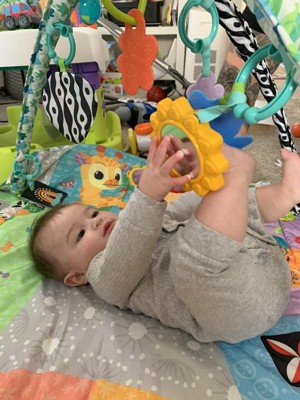 [This review was collected as part of a promotion.] Upon receiving this I noticed it came with a lot of pieces. From the small black and white pictures to the balls to the hanging plastic pieces. It was fairly easy to put together although I did have to read the directions. My son is 5 1/2 months so he is working on rolling over, sitting up and crawling. I like the cards that come with the gym and think they would of been nice for when he was a little younger. I don’t like the plastic piece that comes with it to set the cards on. I also don’t like the blue piece of fabric that comes with it that keeps them together. I think this can actually be dangerous for the baby if they get ahold of it and put it in their mouth. My favorite part of the mat is the different textures and colors. My son liked the crinkly leaves the best as they seemed to keep his attention the most. He also liked the keyboard that played music as that seems to keep him entertained as well. As for the balls, they do come with a bag but I still don’t particularly like them as it is constant clean up. Overall, I know this gym is meant to grow with your baby but I don’t like everything that comes with it. I would prefer just the mat and a few small hanging pieces that come with it.