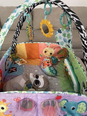 Make every day a gym day with the 7-in-1 Senses & Stages Developmental Gym™. We’ve got your little one covered from tummy time to ball-pit play with activities to help build their muscles, minds and senses. Built-in features are designed to nurture each developmental stage from birth to toddler, and the included guide explains just how to use each play zone and accessory to support your baby’s growth. Encourage little ones to explore the sights, sounds and textures of the mat, musical xylophone and sensory toys. Create a soft, enclosed play space by folding up the sides of the mat. Add 20 balls to create a playful ball pit! When it’s time to clean up, store all the balls in the cute sloth bag. This newborn-to-toddler gym includes a fabric mat, overhead arches, a removable xylophone with stand, a tummy-time pillow, six sensory toys, six links, four image cards, 20 balls, a storage bag and a developmental guide. Mat and pillow are machine washable. Intended for ages Birth+. Requires 3 AA batteries. Batteries included for demo purposes only. New batteries recommended for regular use.