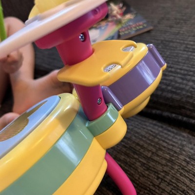 The past few times we’ve gone shopping my 3 year old has been drawn to this drum set, playing with it in the aisle. We decided to finally buy it the other day and I’m very pleased with the purchase. She’s brought it out every day to play with and it’s kept her busy and interested. It’s not too loud even on the loudest setting (there’s 2) and 3 modes of play. I especially love that the cymbal really works. It even looks adorable, I love the pastel colors. Another plus is there is a place on the back to hold the drum sticks which are soft and not pointy so very child friendly. Definitely worth it and one of our favorite toys!