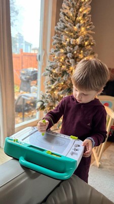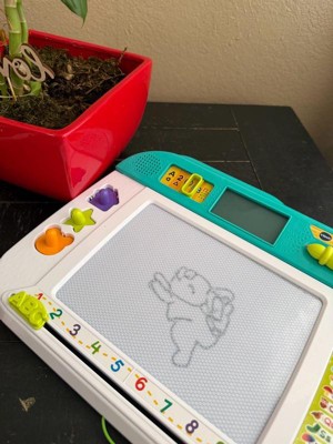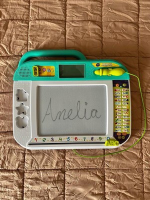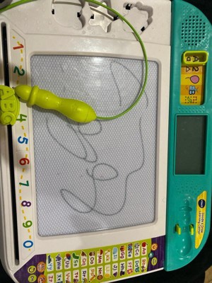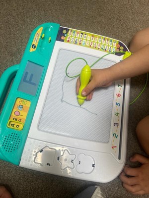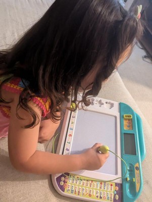 Get drawn into a learning center that shows kids how to write letters, numbers, objects and their own name! Watch the animated demonstrations and follow along with the step-by-step instructions using the stylus. Practice uppercase letters, lowercase letters, numbers 1-10 and 16 shapes. Discover how to draw objects and animals or make masterpieces using three stamps, eight stencils and kid creativity. Draw while listening to different tunes and hear the stylus make silly sounds. Clear it all away for more play by sliding the ABC slider. Intended for ages 3-6 years. Requires 2 AA batteries. Batteries included for demo purposes only. New batteries recommended for regular use.