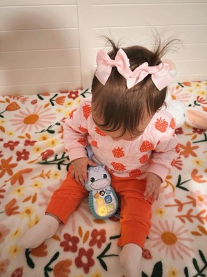 Say hello to this happy hippo! The plush border, soft ears and squishy buttons are so exciting to touch, they make it hard to hang up this toy phone. Call a friend! The hippo can’t wait to talk to you and its friendly phrases encourage pretend play while little ones explore numbers and feelings. Hear the hippo’s calming heartbeat and listen to melodies by pressing the light-up heart button. Easily attaches to strollers, carriers and diaper bags for phone fun on the go. Intended for ages 3+ months. Requires 2 AAA batteries. Batteries included for demo purposes only. New batteries recommended for regular use.