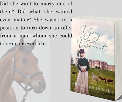 Vying for the Viscount is a delightful tale of a spunky heroine willing to fight for what she wants, a well-meaning hero who is in over his head, and several other colorful characters that you either love or hate, including a step-mother determined to find Bianca a suitable husband, and Aaron Whitworth, the stable manager who deserves his own story! Best of all, there is a romance that makes your heart flutter and your imagination soar as you supply your own interpretation. Author Kristi Ann Hunter has written another enjoyable story and fans of sweet Regency romance will love this first book in the Hearts on the Heath series. It has everything that you look for in a Regency novel!