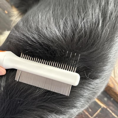 Routine brushing with this dog brush promotes a shiny, healthy coat by stimulating blood flow, removing dead hair, and distributing natural oils across your pet's skin. The flea comb for dogs helps you stay on top of flea and tick prevention, while the detangling comb works wonders to keep your dog’s fur free of knots and mats. This versatile pet brush is ideal for both dogs and cats.