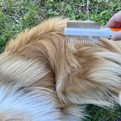 [This review was collected as part of a promotion.] I was very excited for this comb, but unfortunately it came broken. One of the prongs is bent up so that it would hurt my dog if I used that side on her. This may be from shipping, but regardless was frustrating. Other than that it is a great comb! The handle is comfortable and my dog loves it! Perfect for after we’ve been outside for a while to get the dirt and grass out of her fur. I received an incentive to write this review.