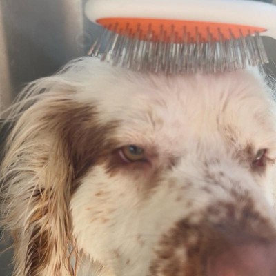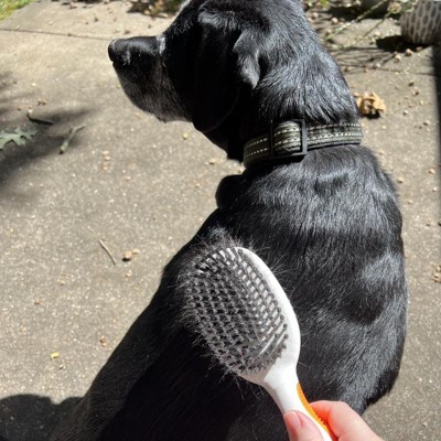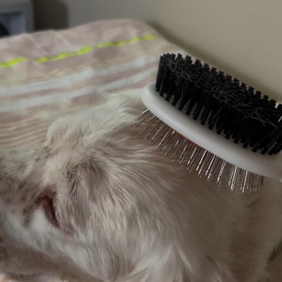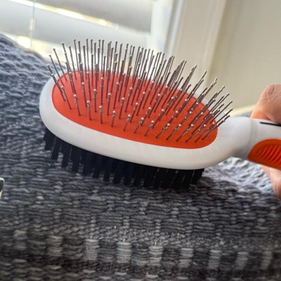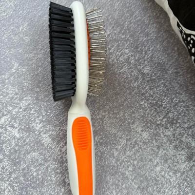[This review was collected as part of a promotion.] Great dog brush! I’m very happy with this purchase. Would recommend! Love that it’s double sided. The pin side is great for brushing out loose/shedding fur and the traditional brush side made my boy’s coat nice and shiny! The handle has a comfortable grip. Easy to manuver! It was very easy to pull out the fur that had collected in the brush. Bye-bye hairballs!! I received an incentive to write this review.