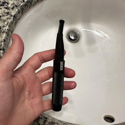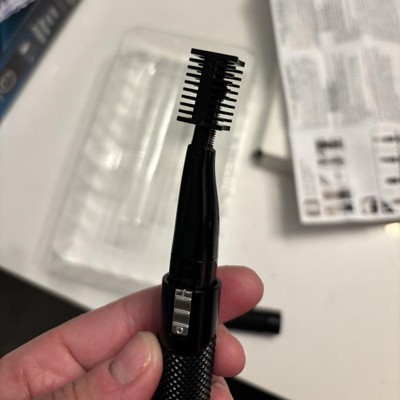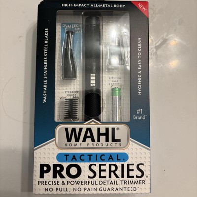 The Wahl Pro Series Tactical® 2-in-1 Lithium Battery Dual Sided Eyebrow and Nose Hair Trimmer for men features a durable, high-impact all-metal tactical body with a knurled grip for a secure hold. Its DualTech® precision double-sided trimmer allows for easy trimming at any angle. The angled head design ensures a comfortable grooming experience for eyebrows, nose, and ear hair. The included eyebrow guide offers 4 cutting lengths for even trimming, while the rotary ear and nose trimmer head is perfect for hard-to-reach areas. The stainless steel blades are easy to clean and reattach. Powered by a cordless Lithium AAA battery (included), this trimmer is ideal for travel. Note: The trimmer may have testing particles that can be easily wiped off.