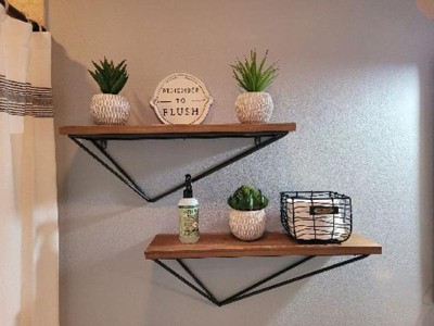Add visual interest to any room with this Wall Mount Floating Pine Shelf with Diamond Shaped Iron Bracket from Danya B. Clean lines and an understated design elevate the piece from mere shelf to stunning wall art. The asymmetrical black metal base provides a unique and contemporary look – a true standout accent piece to modern living spaces. A gorgeous combination of metal and wood offers rustic industrial flair. The sturdy wooden shelf is crafted from natural pine wood and offers just enough space to showcase your books, vases, tabletop decor, picture frames, and more.