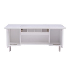 Hair. Check. Makeup. Check. Get ready for your busy day with this compact vanity ledge. Space-saving design features an assortment of storage options. Hair dryer holsters offer a simple solution to organizing makeup, hair accessories, styling tools,or even jewelry - all in one convenient place. The smooth white finish, fold down mirror, and sturdy wall mount system make this a perfect addition to your dressing area or bathroom.