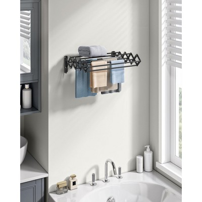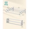 This space-efficient wall-mounted drying rack features 9 staggered rods providing 141.7" of drying space, expanding to 15.7"D and retracting to just 3.9"D when not in use. Constructed with reinforced steel and a diamond-shaped frame, it supports up to 22 lbs and includes drywall anchors for easy installation. Ideal for small bathrooms or laundry rooms, it promotes airflow and keeps clothes separated during drying. Product Size: 15.7"D x 16.5"W x 4.7"H (40 x 42 x 12 cm) Folded Size: 3.9"D x 16.5"W x 4.7"H (10 x 42 x 12 cm) Product Weight: 2 lb (0.9 kg) Max. Total Static Load Capacity: 22 lb (10 kg)