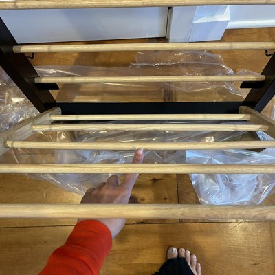 A: The drying rack features a sleek black metal and natural wood design.