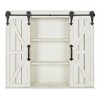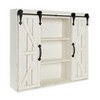 Decorate your home in vintage farmhouse style with these unique hanging wall shelves with sliding barn doors. These shelves can be used to organize your entryway, mudroom, kitchen, bathroom, living room, or guest room. This box shelf has three inner shelves and each side has two shelves to store items of different shapes and sizes. The two barn doors slide to cover either the sides or the center. The three center shelves are each 13.5 inches wide, 5.75 inches deep, and there is 8 inches of height between shelves. The side cubbies are each 7.75 inches wide, 5.75 inches deep, and have 12 inches of height between the two shelves. The outer dimensions of this wall shelving unit are 30 inches wide, 27.25 inches high, and 7.25 inches deep. Two metal Z-bracket hangers are inset on the back of the cabinet for easy secure wall display. This wall cabinet arrives completely assembled ready to use.