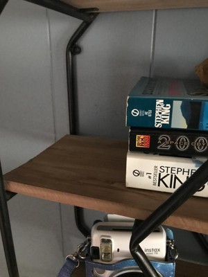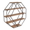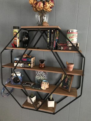 - A modern decorative design, these octagon floating wood wall shelves are secured with a smart matte black metal frame that is 30.5 inches tall and holds 5 MDF wood shelf boards that are a beautiful, rustic brown