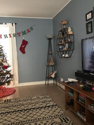 Rustic farmhouse design meets functionality with this floating octagon shelving. Constructed of black metal frame with 5 solid wood shelves, this floating shelving can be used to display your books, photo frames, or knickknacks in your living room or home office. The depth of all the shelves is 6 inches and there is 7.25 inches of vertical space between each shelf. The top and bottom shelves are 13 inches wide, the second and fourth shelves are 27.25 inches wide, and the center shelf is 30.5 inches wide. The display dimensions of the floating shelves are 30.5 inches wide by 6.5 inches deep by 30.5 inches high. This decorative octagon shelving is versatile, functional, and will be a beautiful accent in any room of the home.