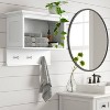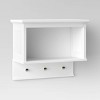 Keep bathroom items neatly organized and within reach with this Wall Shelf with Hooks from Threshold™. Made with a sturdy hardwood frame for long-lasting use, this universal storage features a large white shelf to display and hold laundry supplies, toiletries or other essentials, and it includes three hooks that can be used for coats, jackets, clothing, towels, wet swimsuits and more. Use this white universal storage unit to give small spaces character, or place in the bathroom to bring functionality to your space.