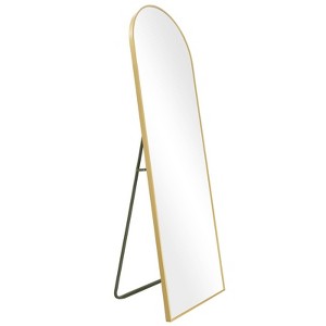 The versatile Arched Full Length Mirror with Stand is a 64"x21" mirror that blends durability and style to enhance any living space. Featuring a sturdy gold aluminum alloy frame, it offers both a sleek aesthetic and reliable strength, perfect for leaning, standing independently with its integrated support, or securely mounting vertically or horizontally. Its high-definition silver nitrate coating provides crystal-clear reflections, while the embedded explosion-proof film ensures safety by preventing glass shattering upon impact. Ideal for bedrooms, entryways, or bathrooms, this mirror adds elegance and practicality to your decor, reflecting both your style and peace of mind.