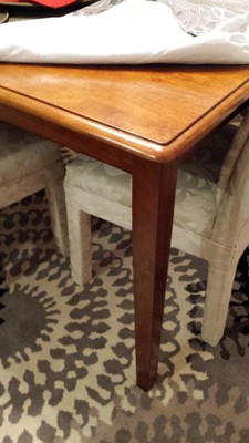 It's a nice sturdy table. That said, like other reviewers have mentioned; it is a lighter color than pictured but dark enough to work. Mine came with a damaged corner that Target is willing to make right. Inconvenient but appreciated. I would recommend this table for smaller dining rooms. Although I ordered 4 matching chairs and the matching bench seat, in my estimation one could only seat 4 with any elbow room; Not the UP to 6 mentioned in the advertisement. Overall it's a good piece of furniture. The 1 picture I'm including is of my damaged table so that one might check on that immediately. We pulled ours out of the box Top side Down, installed the legs, flipped it over and then we saw the damage. The packaging looked fine. I believe this is a manufacturing defect and may or may not repeat itself.