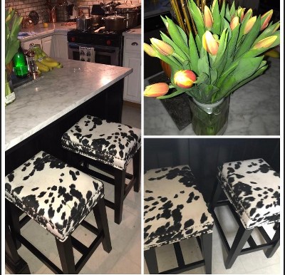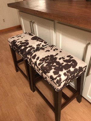 A: The legs on the black cow print still are black. The brown and grey stools are walnut finish.