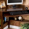 Maximize space and productivity with this corner computer desk. A spacious desktop with cord control opening easily holds your laptop, monitor, or notebooks, while a slide-out keyboard tray and corner shelf neatly tuck away office supplies and electronics. Place this multifunctional writing desk in your home office to organize your work space, or add to your living area to create a small space nook for finishing homework or paying bills. Bring function and style to your floorplan with this corner storage desk.