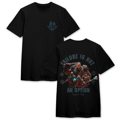CUSTOM DESIGN: The main characters from Warhammer 40000 Darktide appear on the front of this graphic as blue letters around them read, "Failure Is Not An Option." The game's logo decorates the back. Fans of the game will love this fun design.