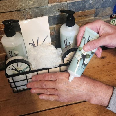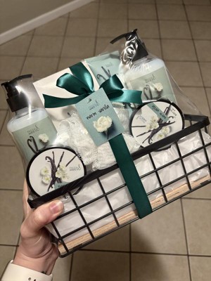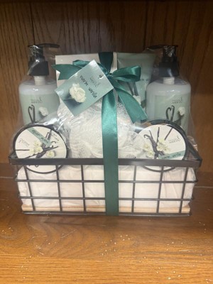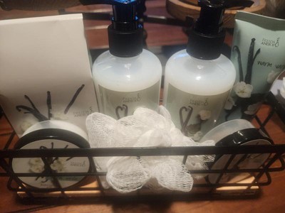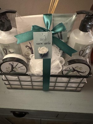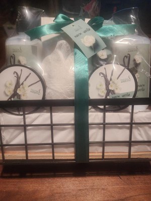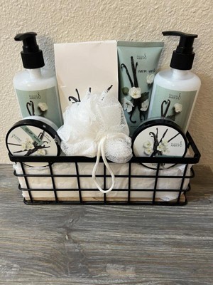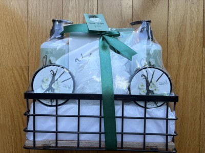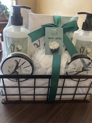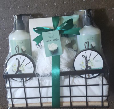 This basket would make a great gift for anyone! The basket contains a warm vanilla body lotion, body scrub, shower gel, bubble bath, large body lotion with pump and bath salt. It comes packaged in a small wire basket wrapped in a green bow!
