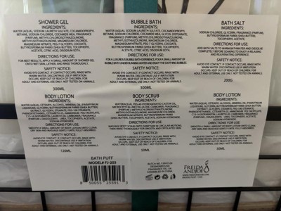 This is an overpriced junky gift set. The scent is okay but none of the products are high quality. The lotion is sticky and the bath products are drying. The board on the bottom of the holder container is splintered. All the containers have glue on them that is impossible to remove. I do not recommend.