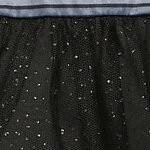 Checkered red, black and white short sleeve peplum top; silver foil Harley Quinn logo on chest; button, belt and spike bracelet design; matching bow; Dazzling glitter-printed mesh top skirt with poly spandex lining; leggings with elastic waist and denim shorts over tights design