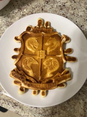 [This review was collected as part of a promotion.] This is a cute little waffle maker that makes pretty good waffles. It's very clear on each waffle what the shape of the iron was and you can see each part of the Hogwarts crest. It's very simple to use and cleaned up really nice when you were done. It does take a little bit of time to cool off once you're done making waffles but it works very well for what it is.